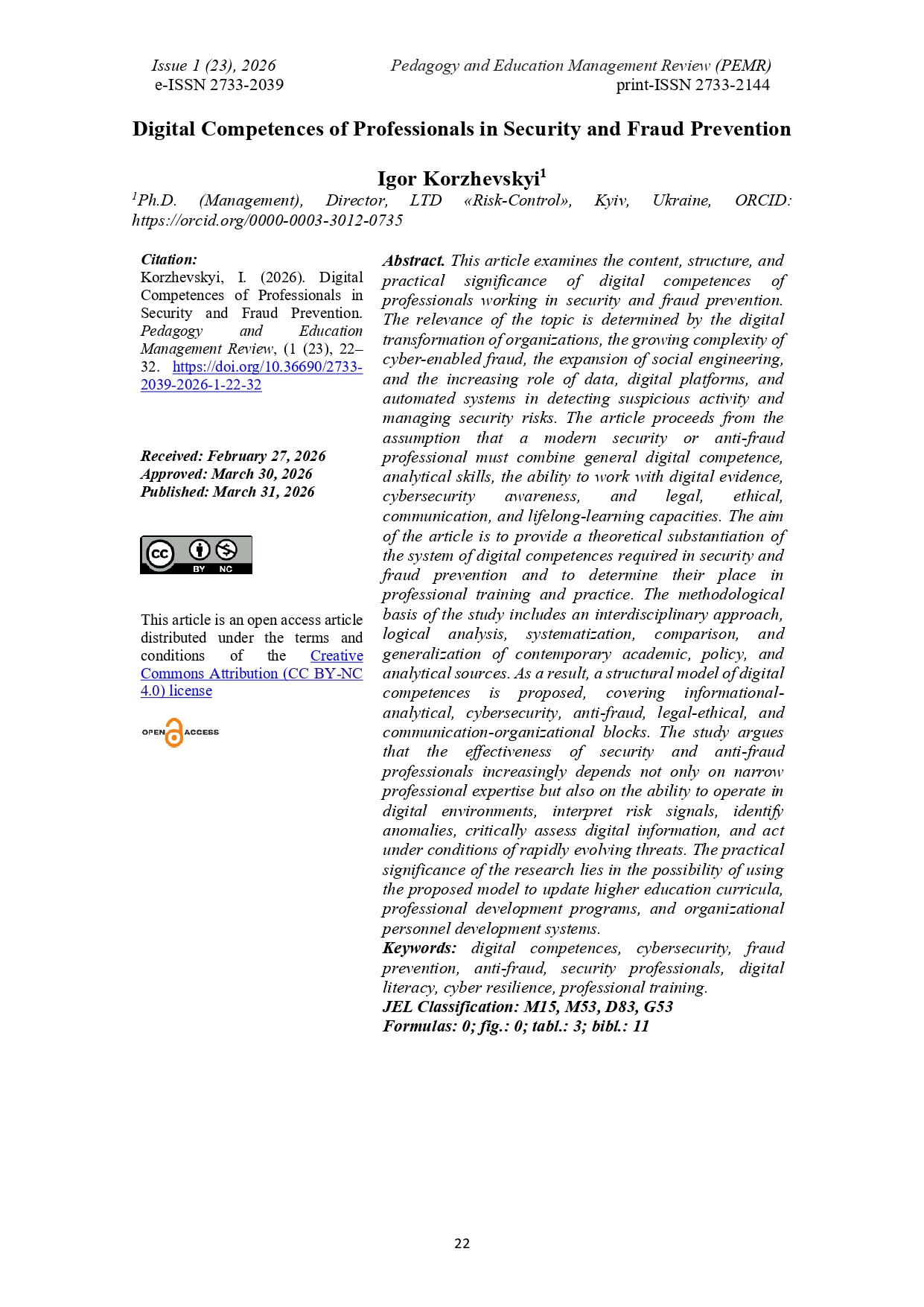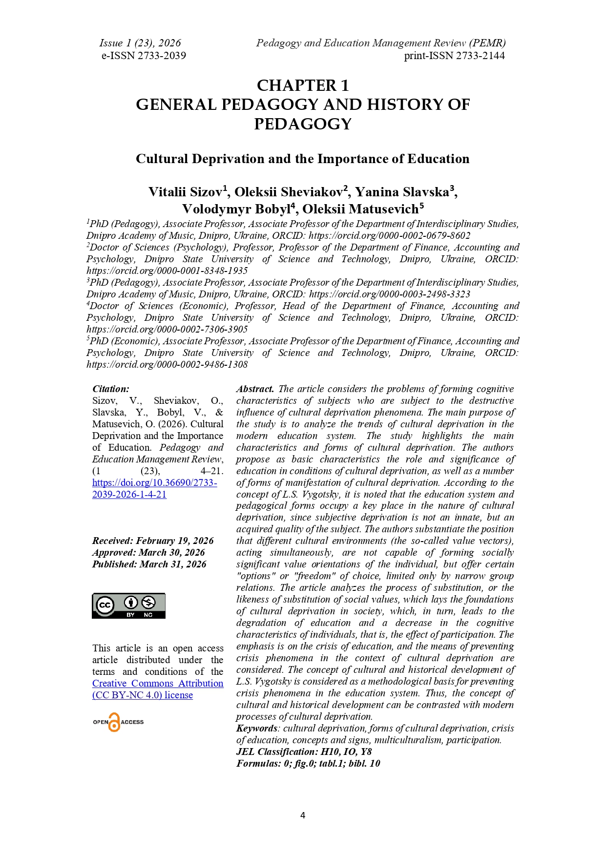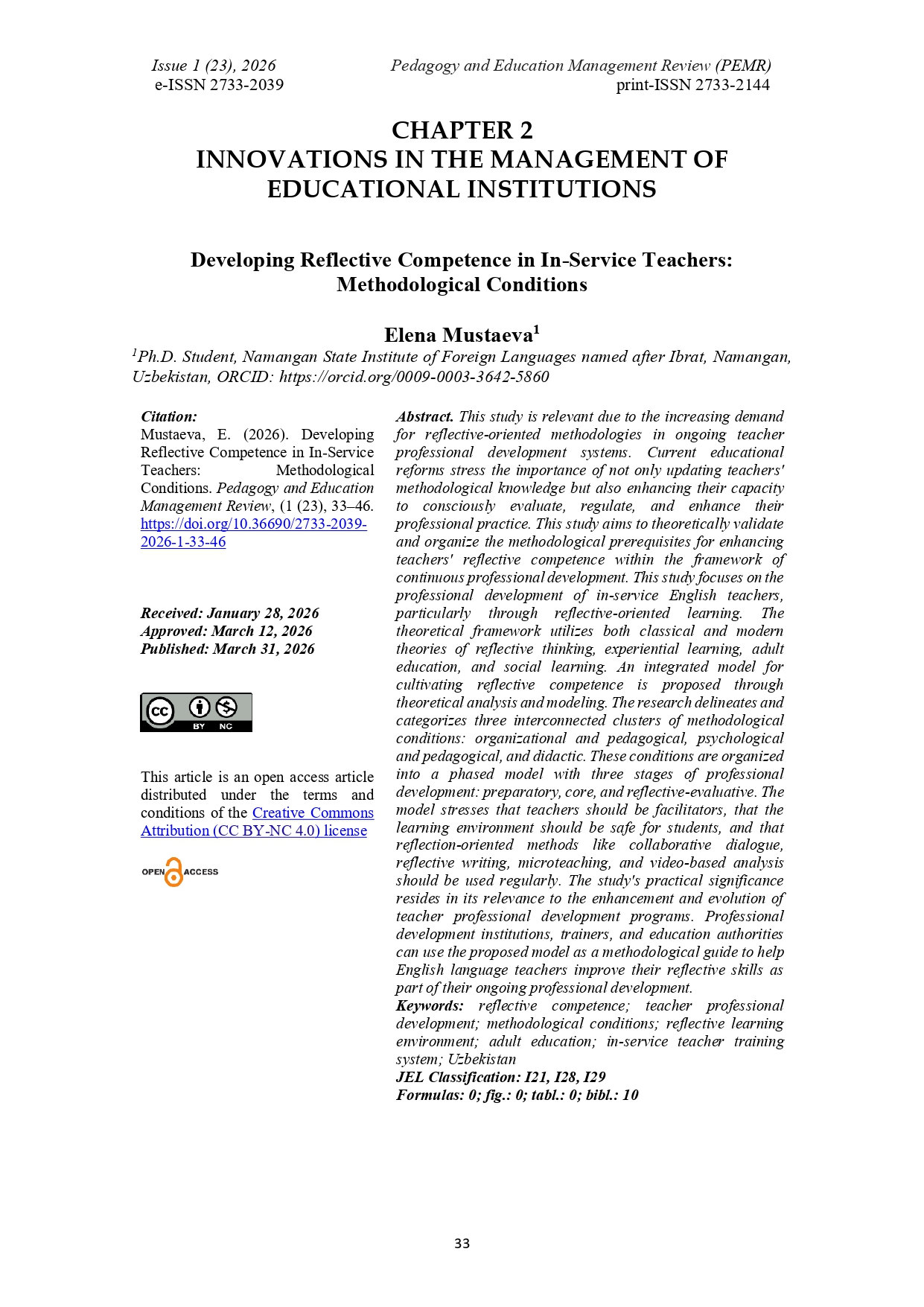 The publisher of the «PEDAGOGY AND EDUCATION MANAGEMENT REVIEW» is Scientific Center of Innovative Research OÜ (Tallinn, Estonia). Publication frequency: quarterly (March, June, September, December) Languages of edition: English International databases and catalogs that index the publication: - National Library of Estonia; - Eurasian Scientific Journal Index; - Academic Recourse Index (ResearchBib); - Advanced Science Index (Germany); - ICI World of Journals (Poland); - Open Ukrainian Citation Index (Ukraine); - Directory of Research Journals Indexing (India); - OpenAIRE |