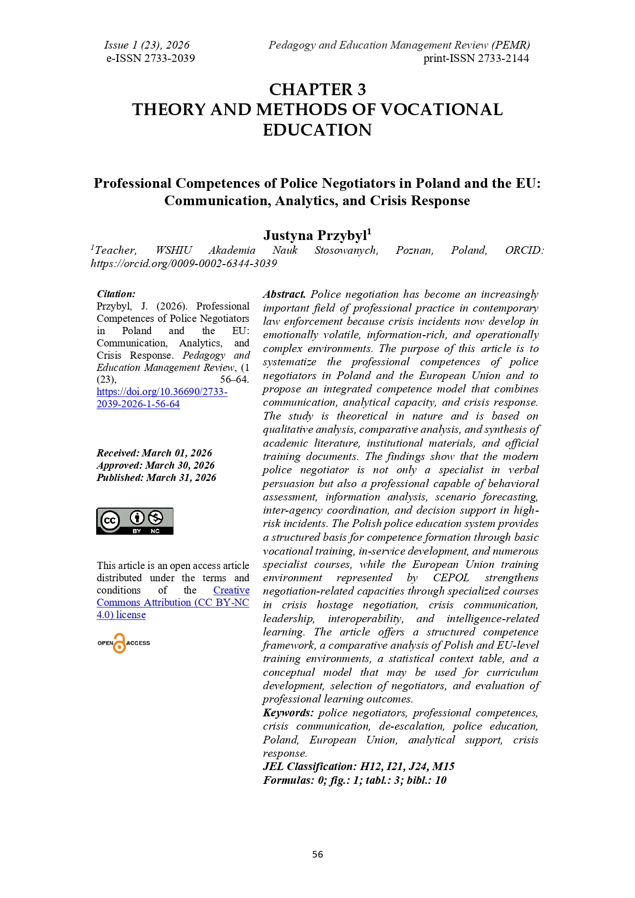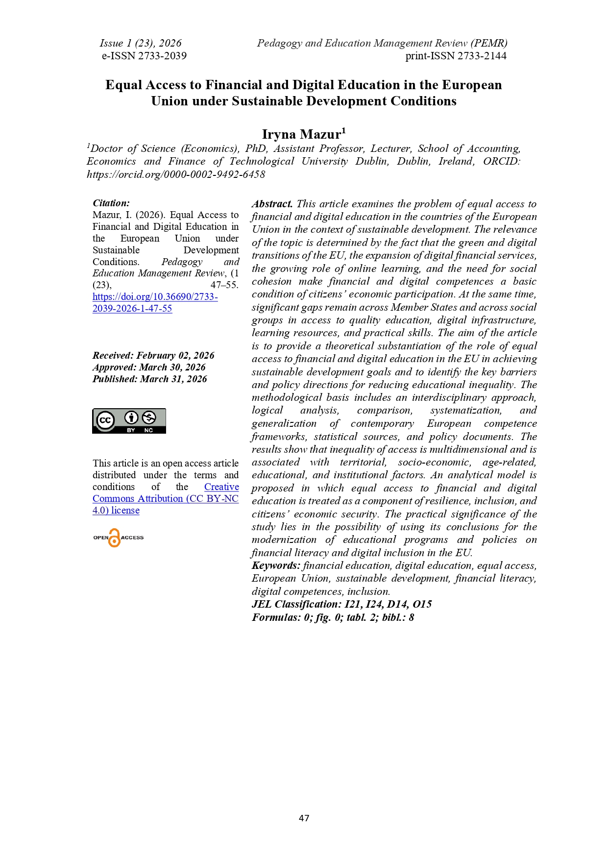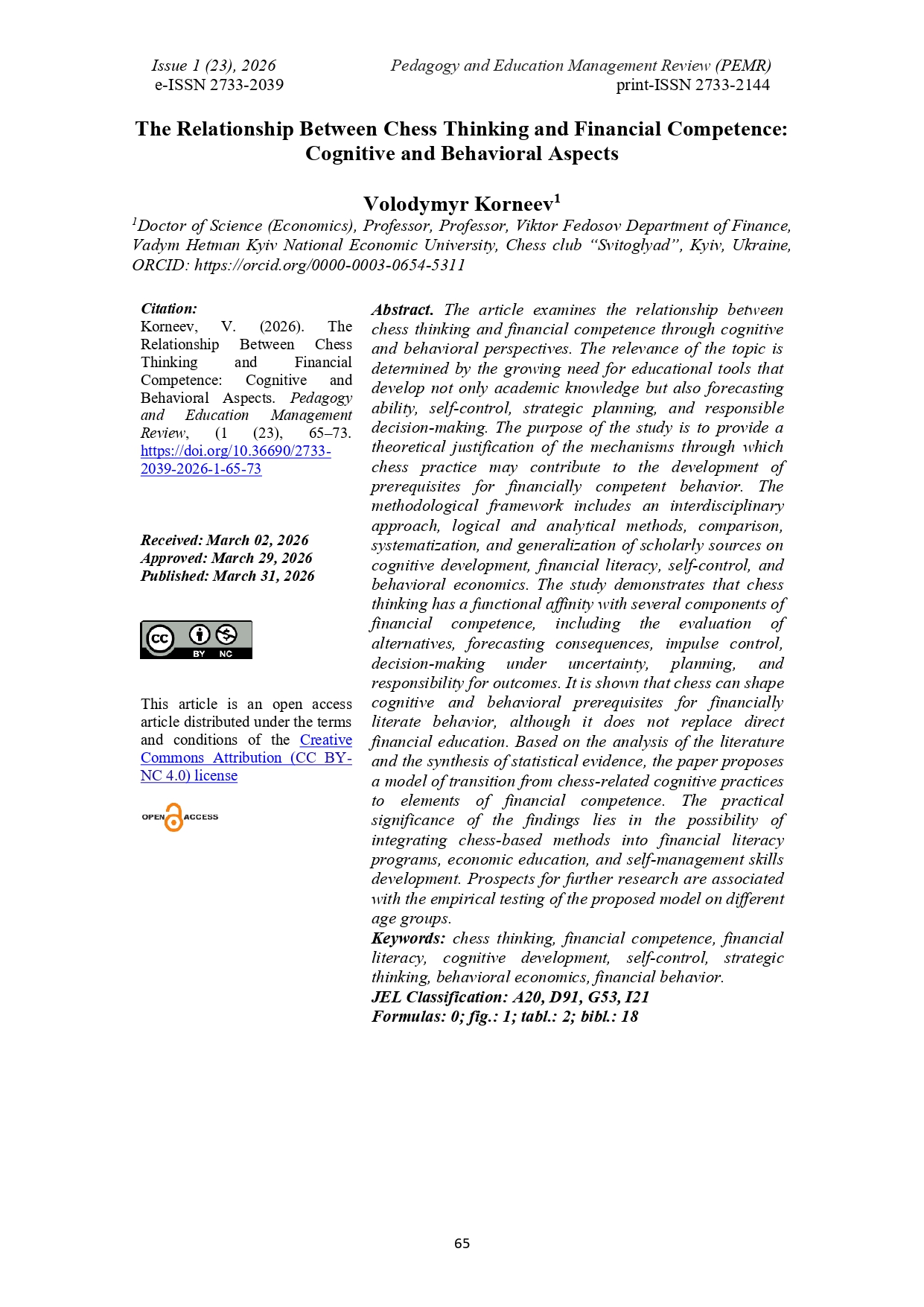 The publisher of the «PEDAGOGY AND EDUCATION MANAGEMENT REVIEW» is Scientific Center of Innovative Research OÜ (Tallinn, Estonia). Publication frequency: quarterly (March, June, September, December) Languages of edition: English International databases and catalogs that index the publication: - National Library of Estonia; - Eurasian Scientific Journal Index; - Academic Recourse Index (ResearchBib); - Advanced Science Index (Germany); - ICI World of Journals (Poland); - Open Ukrainian Citation Index (Ukraine); - Directory of Research Journals Indexing (India); - OpenAIRE |